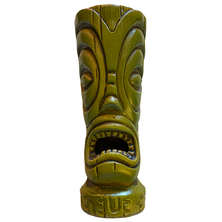 This ceramic tiki mug depicts a traditional groaning tiki face with horizontal, almond-shaped eyes and a hollow mouth.