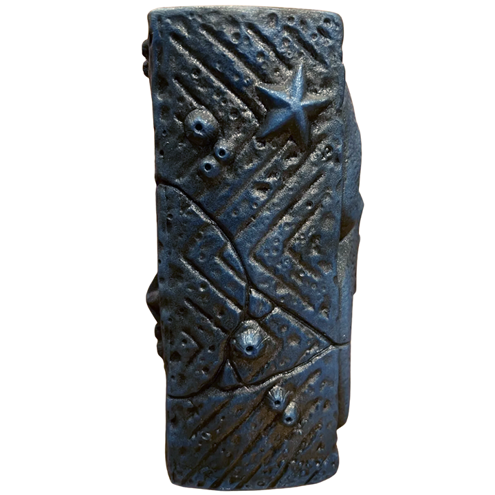 This ceramic cocktail mug was designed by VanTiki and produced in Portland, OR by Munktiki for Tiki Kon’s 2014 event. It depicts an ancient weathered vessel marked with a skull that was “found underwater in the ruins off the shore of VanTiki island.” The back side of the mug has faux barnacles and starfish.