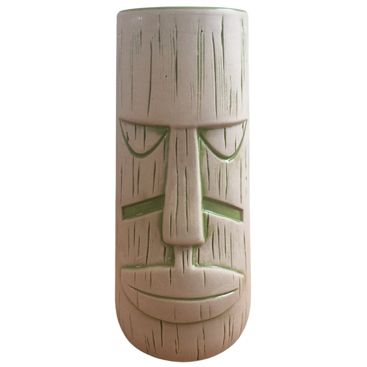 This ceramic tiki mug depicts a white cylindrical face with green accents.