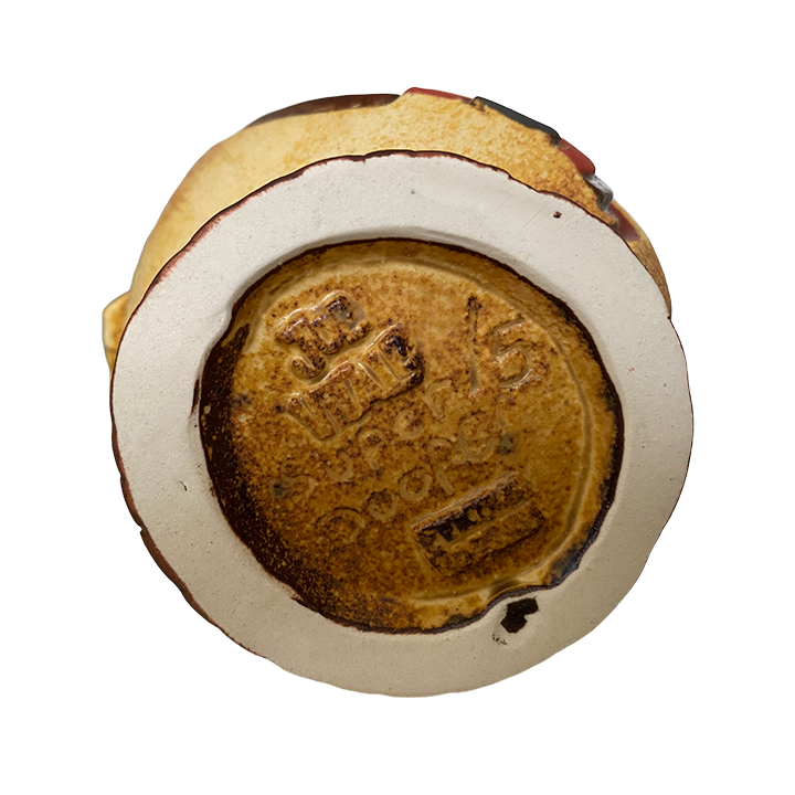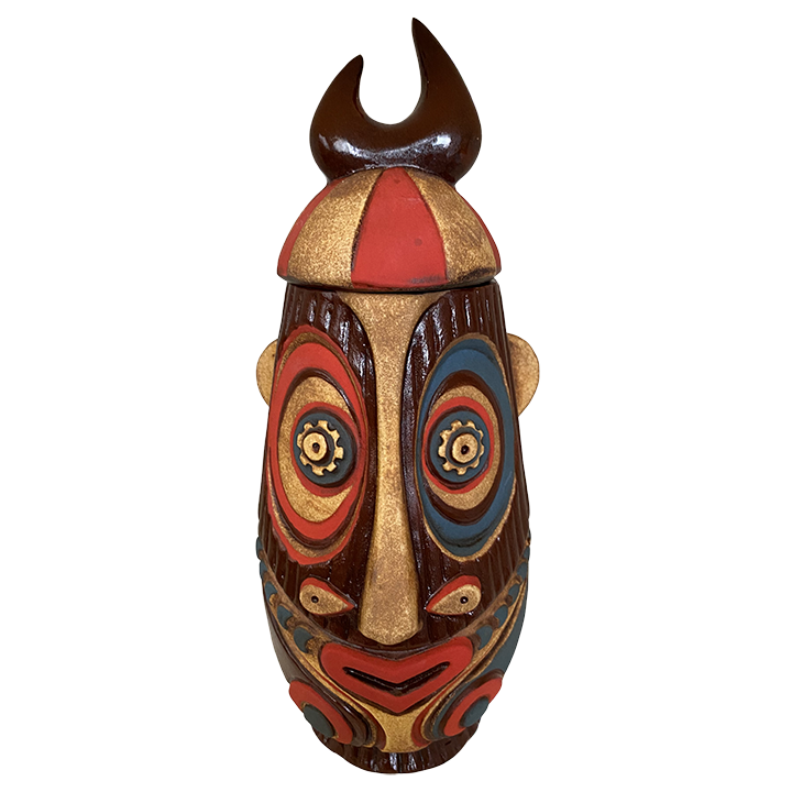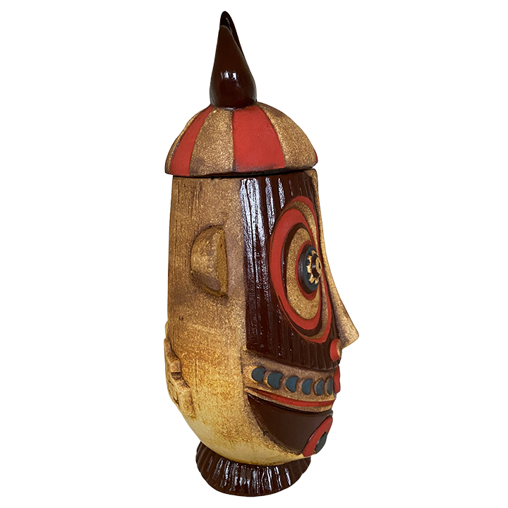 This multicolored tiki mug depicts an oval shaped face with large round eyes that is wearing a pointy hat.