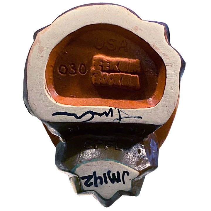 This ceramic mug depicts a tropical bird constructed using various cocktail garnishes. It is the official 2022 event mug of Inuhele, Atlanta’s Tiki and Polynesian Pop Weekend. It was designed by Jonathan Chaffin of Horror in Clay, sculpted by John Mulder, and manufactured in the United States by Eekum Bookum.