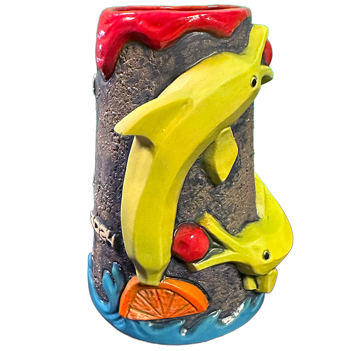 This ceramic mug depicts a pair of dolphins constructed from various cocktail garnishes. They are jumping out of water near an active volcano. It is the official 2024 event mug of Inuhele, Atlanta’s Tiki and Polynesian Pop Weekend. It was designed by Jonathan Chaffin of Horror in Clay, sculpted by John Mulder, and manufactured in the United States by Eekum Bookum.