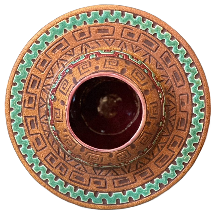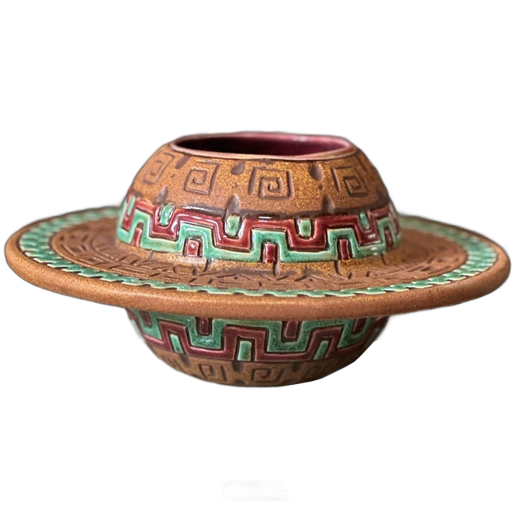 This ceramic cocktail mug was designed and produced in the United States by Riki Tat Tiki. It is shaped like the planet Saturn and hand carved with intricate details that make it one-of-a-kind.