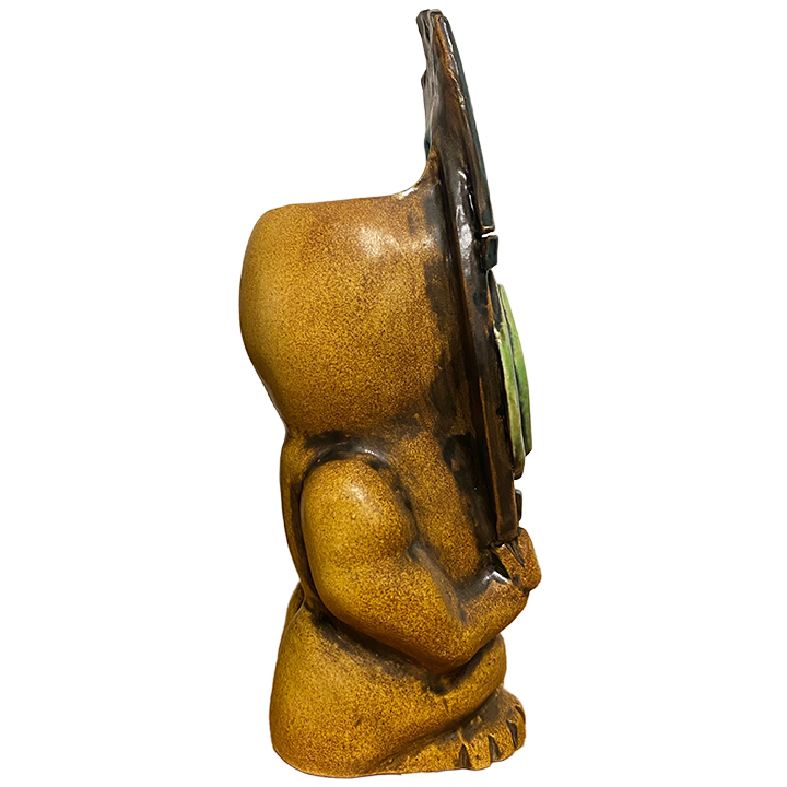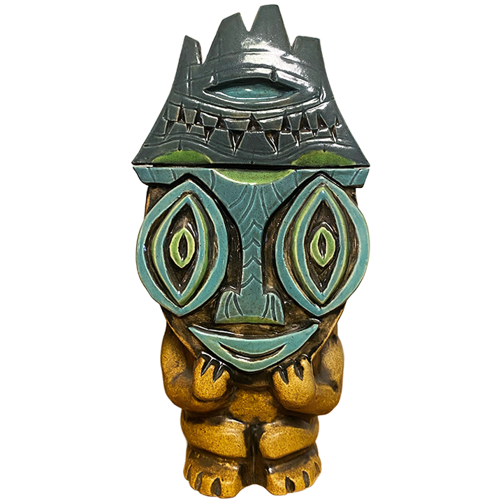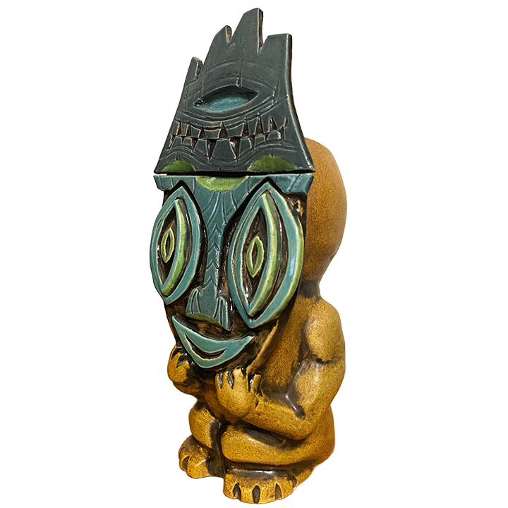 This tiki mug is part of TikiRob’s signature Mask Mug Collection. Rob’s collection features various masks that are significant to tiki culture. Some of the mugs are hand built one-of-a-kinds commissioned by collectors or sold in art shows. Other mask mugs are limited edition runs of usually no more than 50 mugs. Even Rob’s small mug runs have distinct carvings and glazes that make each mug unique. Rob’s mugs are made in South Maui. This particular mask mug is a one-of-a-kind mug inspired by and designed for artist Brian “B-Rex” Rechenmacher.
