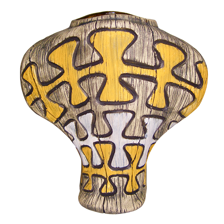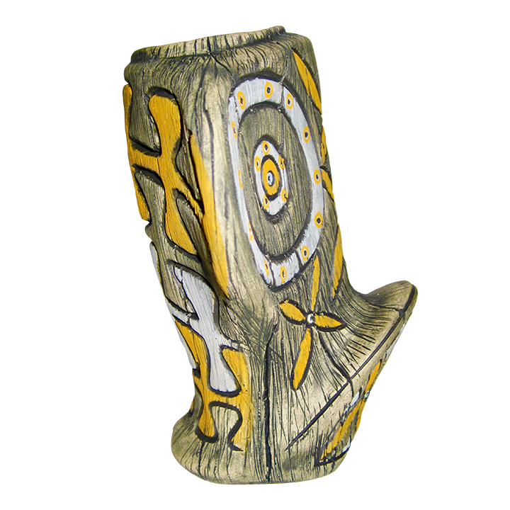 This tiki mug is designed to look like a dance mask and features wide circular eyes and a frown.