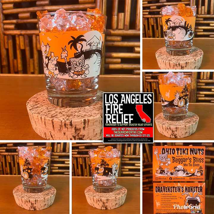 This Mai Tai glass was generously donated by Ohio Tiki Nuts to raise funds for charity. 100% of the net proceeds from this glass will be donated to support relief efforts in LA after the recent devastating wildfires.