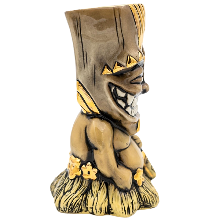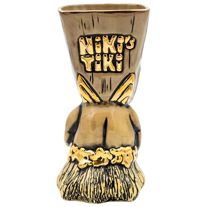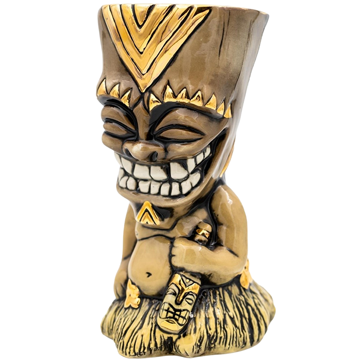 This ceramic cocktail mug depicts a sitting tiki with a big belly, wide grin, and grass skirt. It is manufactured by Niki’s Tiki. This particular version, the Golden Belly Warrior, is a limited run of just five mugs and it features radiant golden luster.