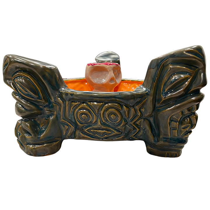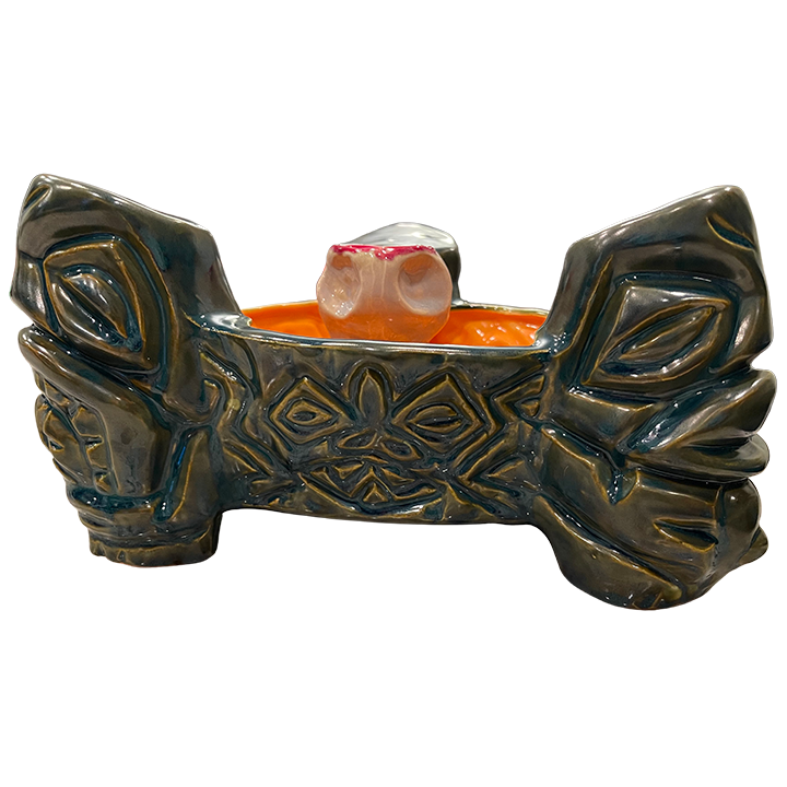 This ceramic bowl has three Tiki pillars that support a tower of skulls in the center of the bowl. It is made in Bosko’s signature style.