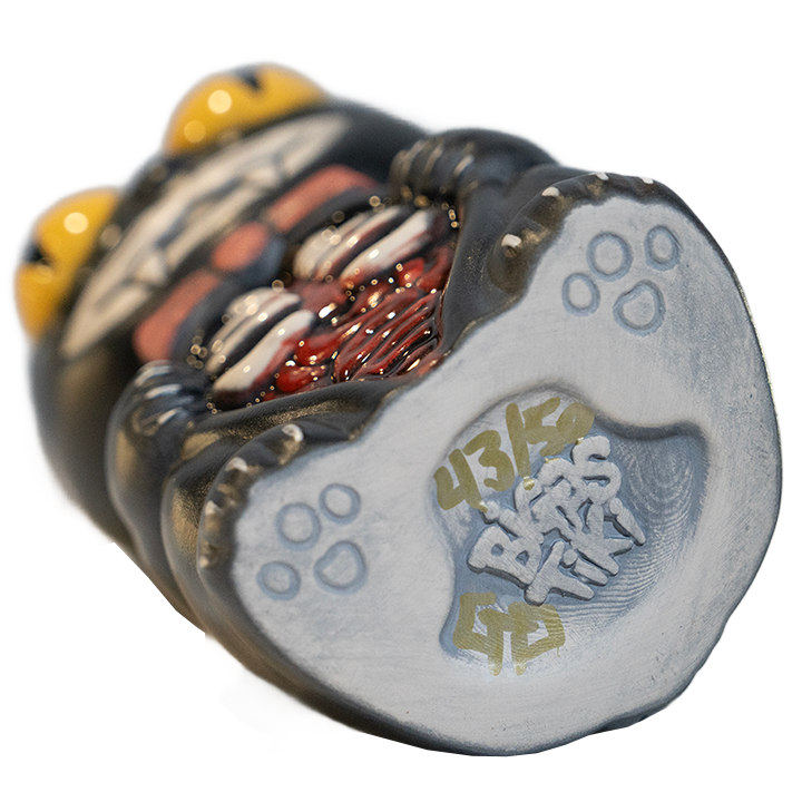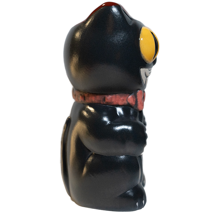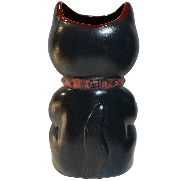 This ceramic cocktail mug by Mike Biggs depicts a feline stylized like a vintage cat clock with its guts pilling out. The cat’s rib cage and organs are exposed. It comes with a Porch Cat recipe card and this version features a black glaze.