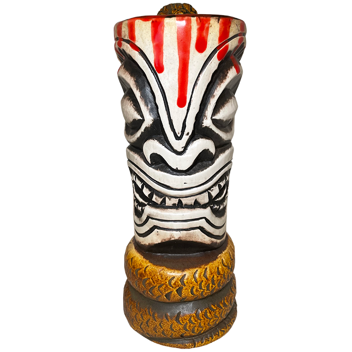 This ceramic mug depicts a cobra snake coiled around and peaking its head over a Tiki. The Tiki is grimacing as it is being strangled.