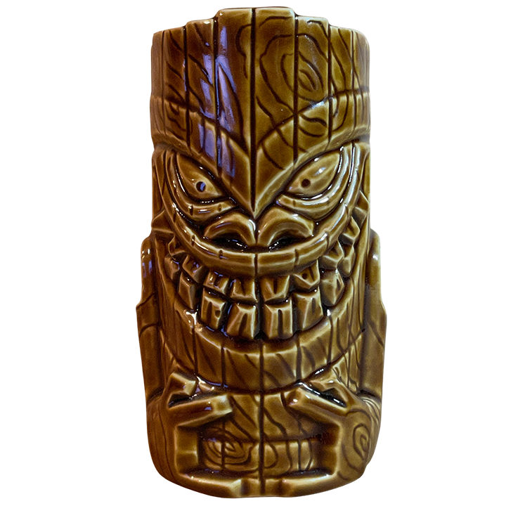 This ceramic mug depicts a crazed Tiki with gnarly teeth giving hand signals. It was part of the first set of mugs artist BigToe designed for Tiki Farm. The set included Crazy Niho, Leano, Ukulolo. The set came in brown and green. A smaller “Mug shot” set was also sold in brown only.