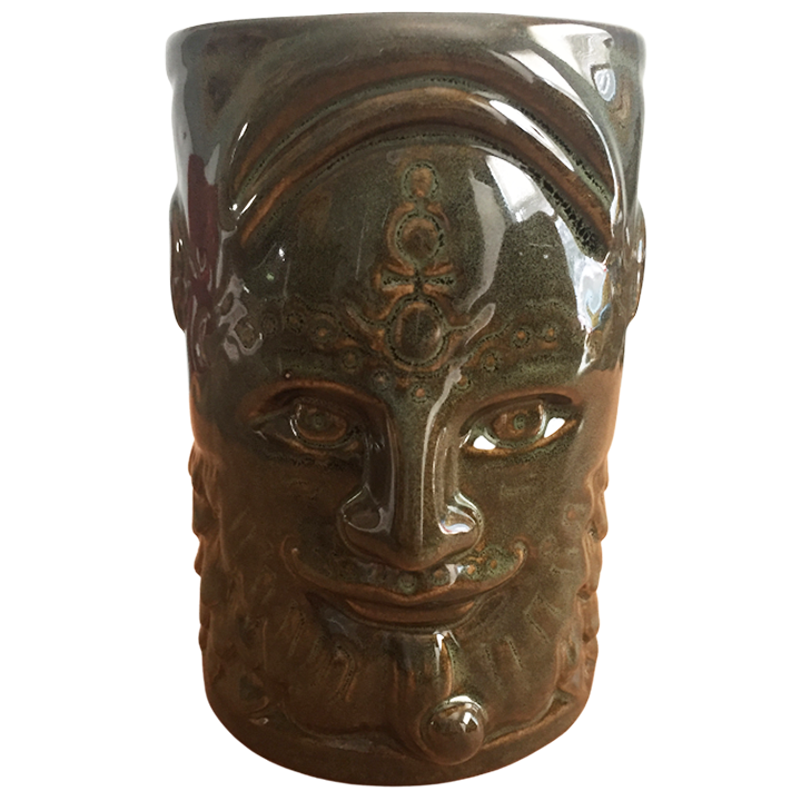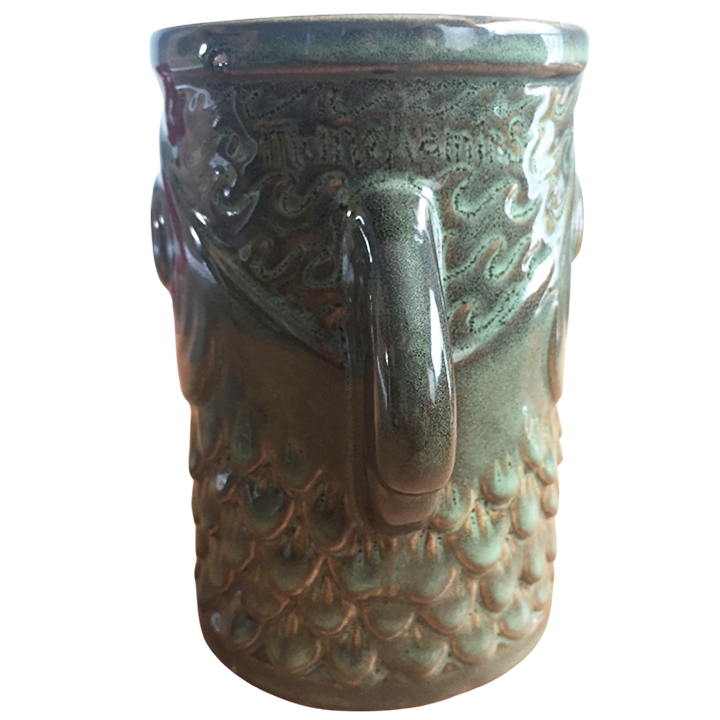 This ceramic tiki mug depicts the fish God Dagon, a fertility God. It has a handle and is covered in fish scales. Some people associate Dagon with the H.P. Lovecraft Cthulhu mythos, where he is depicted as a “Great Old One” who leads the “Deep Ones”.