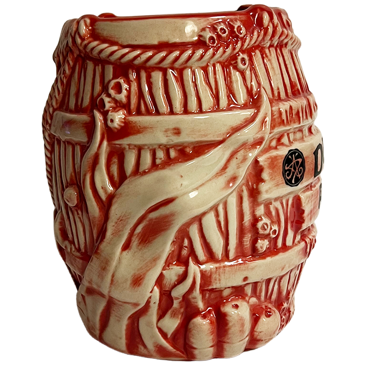 This ceramic cocktail mug was designed and sculpted by Rob Fink for Munktiki Imports. It is shaped like a rum barrel covered in ocean debris such as starfish, nautical ropes, seaweed, wooden boards, and barnacles. This edition has been branded for Devil’s Reef in Tacoma, WA, and given a red glaze treatment.