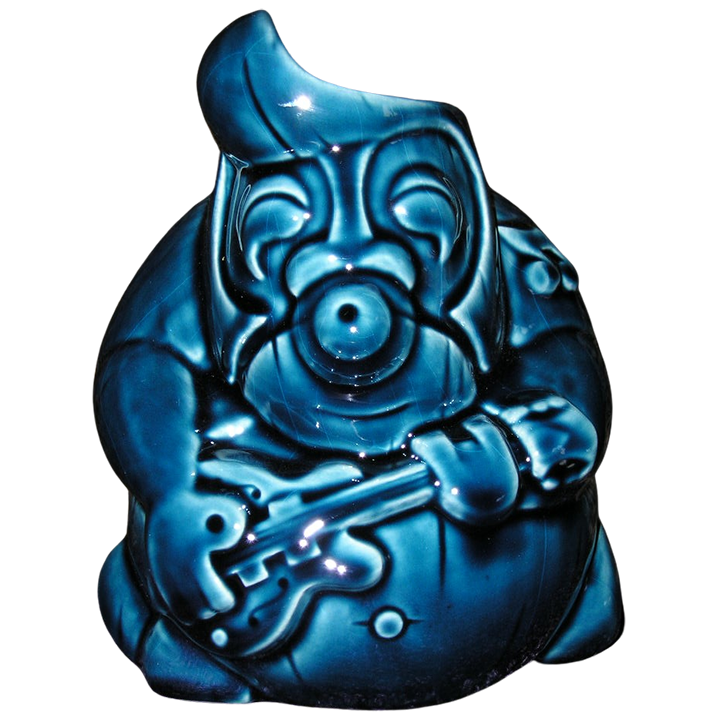 This ceramic cocktail mug depicts a fat Elvis with a protruding belly button strumming a guitar while singing. It features classic Elvis hair, musical notes, and closed teardrop-shaped eyes.