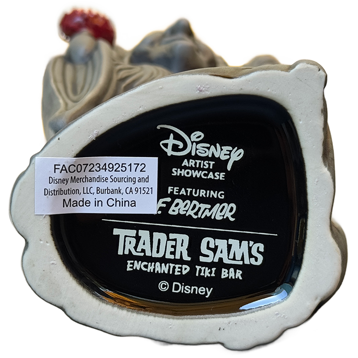 Unique Markings: “Disney Artist Showcase Featuring Florian Bertmer Trader Sam’s Enchanted Tiki Bar Disney” is written on the bottom of this mug, along with a sticker that reads “FAC07234925172 Disney Merchandise Sourcing and Distribution, LLC, Burbank, CA 91521 Made In China”.