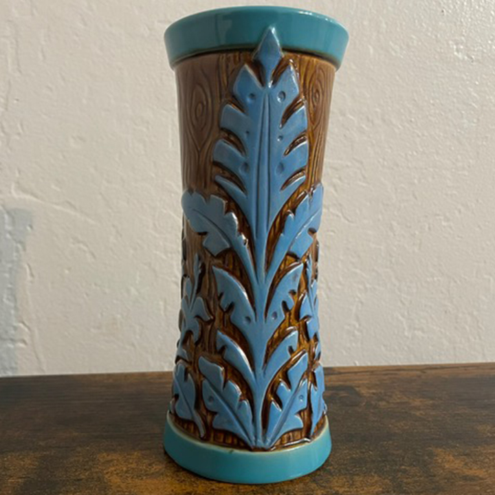 This ceramic cocktail mug was generously donated from the private collection of Marcos Ortiz to raise funds for Los Angeles. 100% of the net proceeds from this mug will be donated to support relief efforts in LA after the ongoing devastating wildfires. This mug features a raised blue tiki face and jungle leaves on top of a faux wooden background.