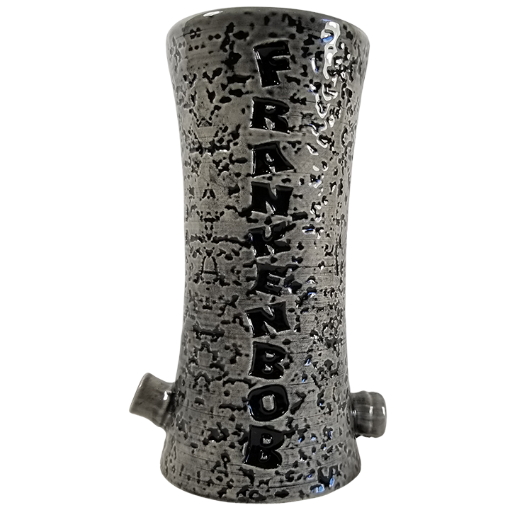 This ceramic mug combines classic Tiki icon TikiBob with Frankenstein’s monster. It has a classic tumbler shape with protruding “bolts” in the neck and “stitches” around the rim of the mug.