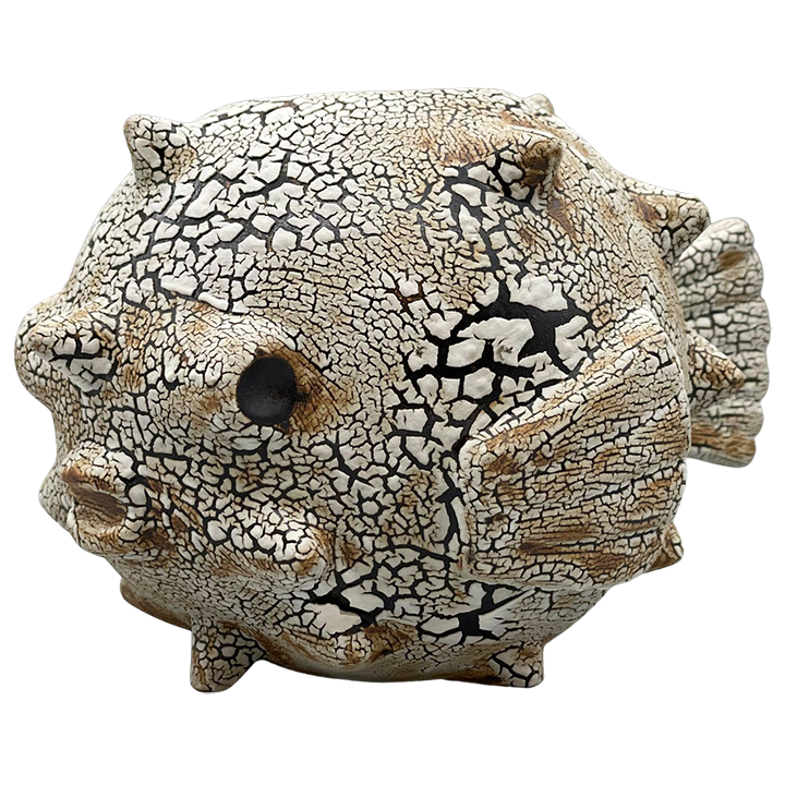 This ceramic cocktail mug depicts a full size Fugu, or puffer fish, with large fins and multiple spines. This particular version features a unique crackle glaze that shows black underneath its tan top coat.