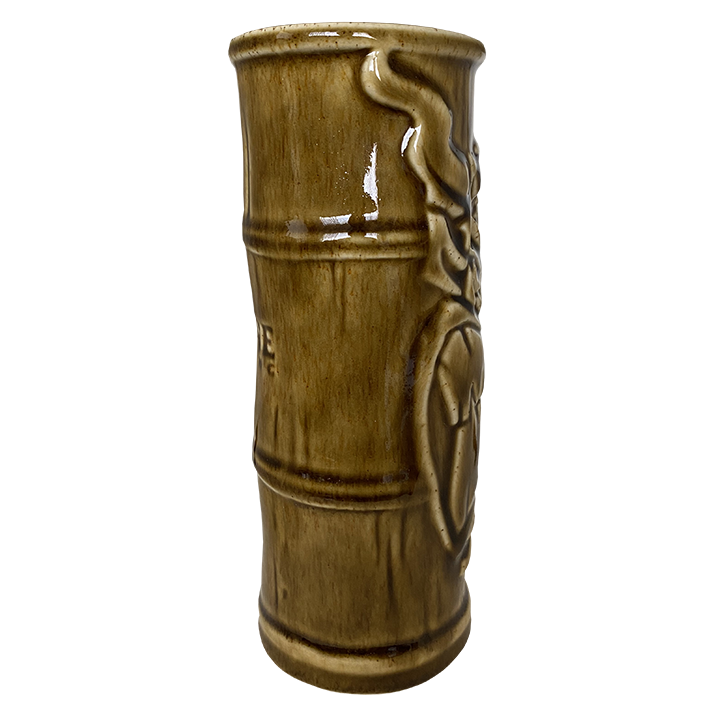 This brown tiki mug depicts a gargoyle carved into a piece of bamboo.