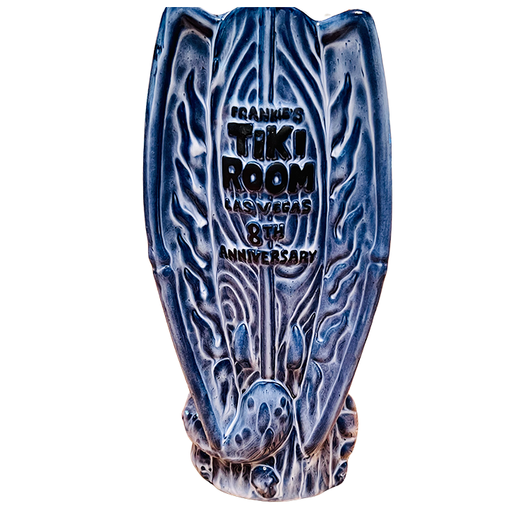 This ceramic cocktail mug depicts a mischievous looking dragon with razor sharp talons and a mouthful of jagged teeth. It was released for the 8th anniversary of Frankie’s Tiki Room in Las Vegas.
