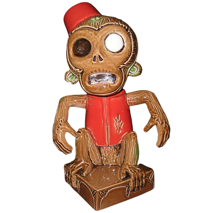 This ceramic decanter depicts a fez wearing monkey with a skull face wearing a red jacket.