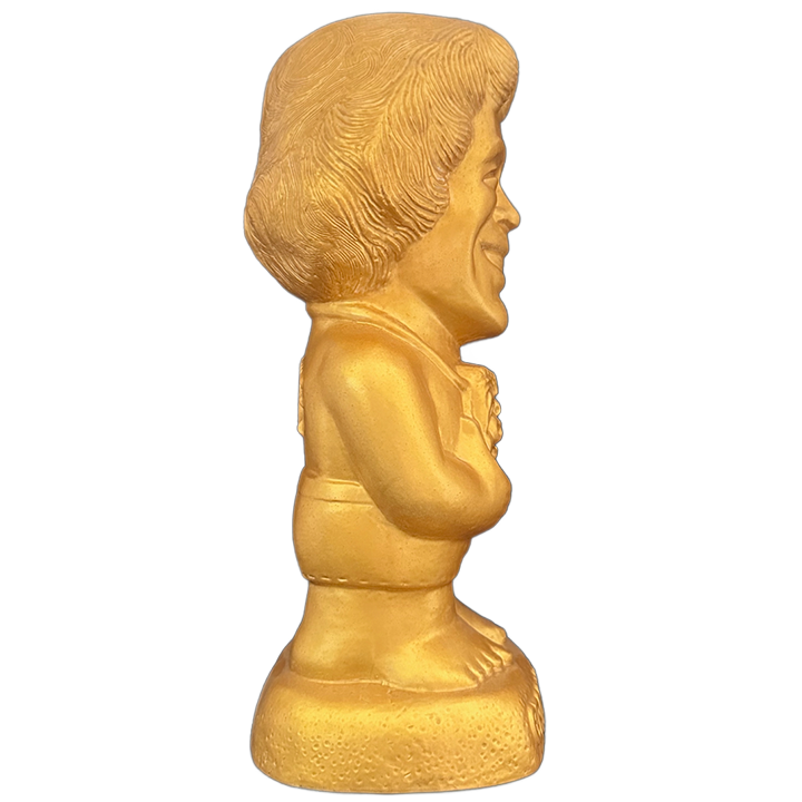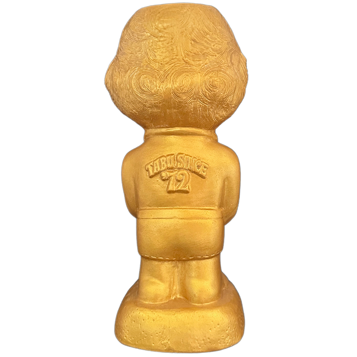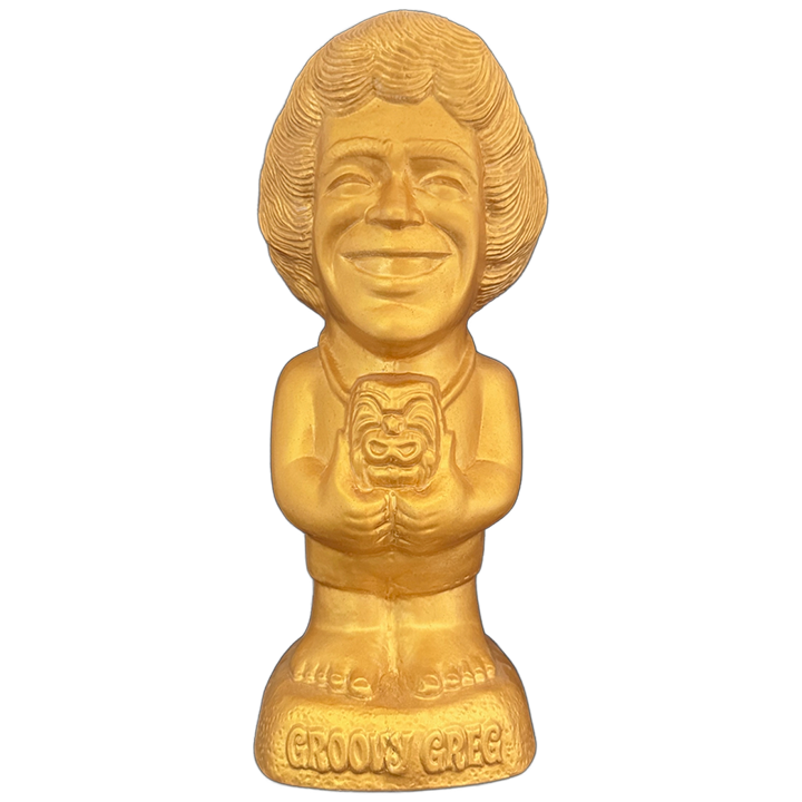 This ceramic mug fan art tribute was designed and sold by Tiki Maniacs. It depicts a favorite 1969 to 1974 TV show character as portrayed by teen idol actor and singer Barry Williams. Groovy Greg 50th Anniversary Gold Edition commemorates Barry William’s 1972 trip to an idealized Hawaii that introduced a new generation to the wonders of tiki culture. Barry officially authorized this mug in his likeness which was expertly sculpted by Dave “Squid” Cohen in a whimsical style reminiscent of the 1970’s United Airlines Menehune Advertising Figures. The mug exterior is completely covered in a shiny metallic matte gold glaze, while the interior and bottom are glossy white. Mugs include a custom made surfboard shaped swizzle stick in pearlized metallic gold color. Also includes a 5×7 postcard print featuring the Barry Williams approved image that inspired the mug plus an exclusive Groovy Greg cocktail recipe by renown mixologist Kelly “Old Man” Merrell!