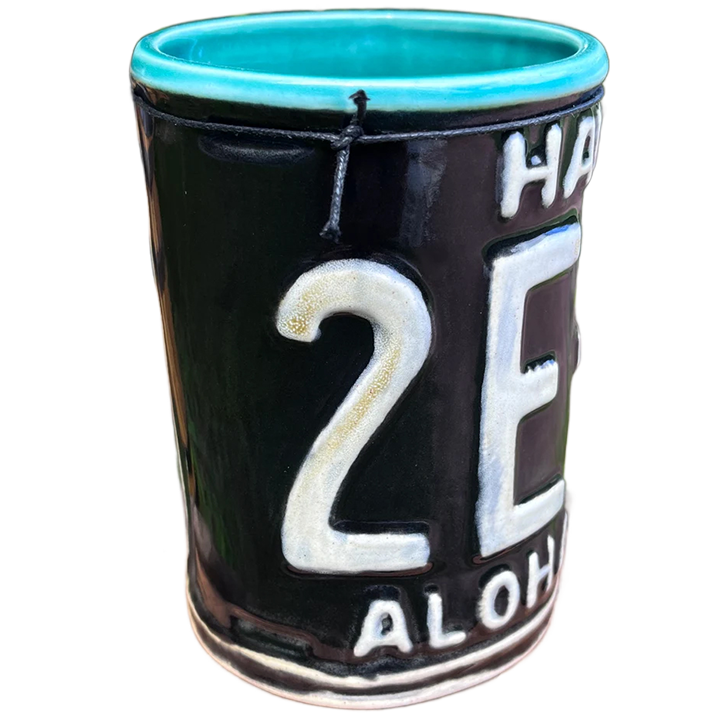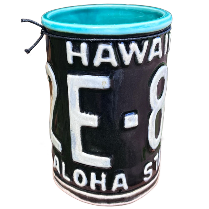 This ceramic cocktail mug was designed and manufactured by TikiPop for his Maui-based shop Beachbumz. It depicts a vintage style Hawaiian license plate bent into a cylindrical shape. This mugs comes in various glaze colors and combinations. This particular mug has a blue interior.