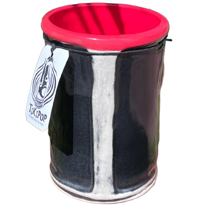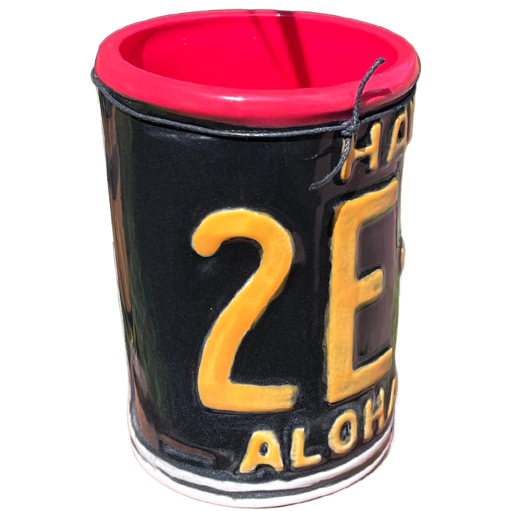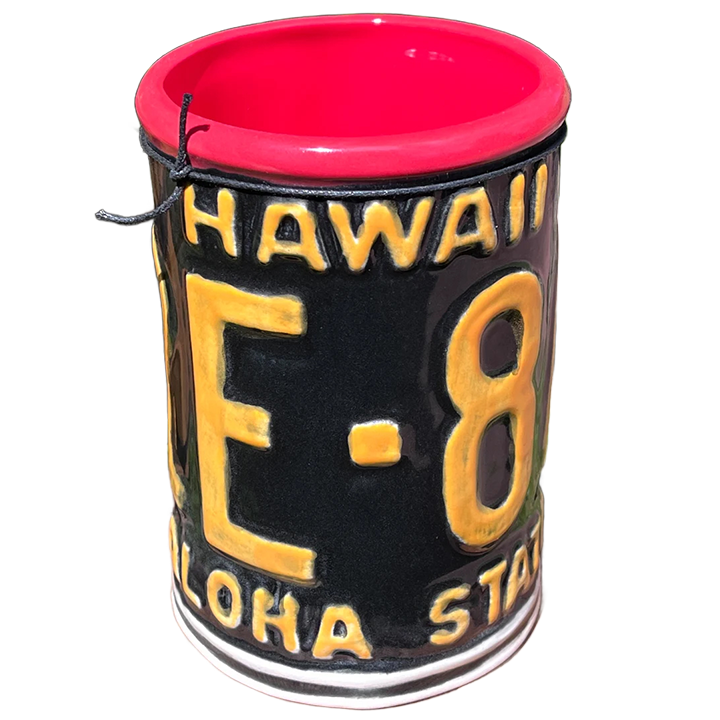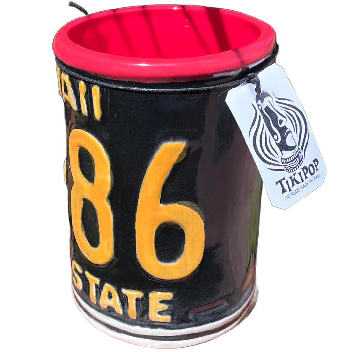 This ceramic cocktail mug was designed and manufactured by TikiPop for his Maui-based shop Beachbumz. It depicts a vintage style Hawaiian license plate bent into a cylindrical shape. This mugs comes in various glaze colors and combinations. This particular mug has a glossy black and yellow glazed license plate with a red interior.