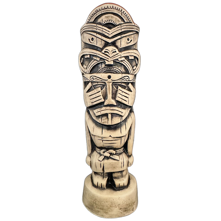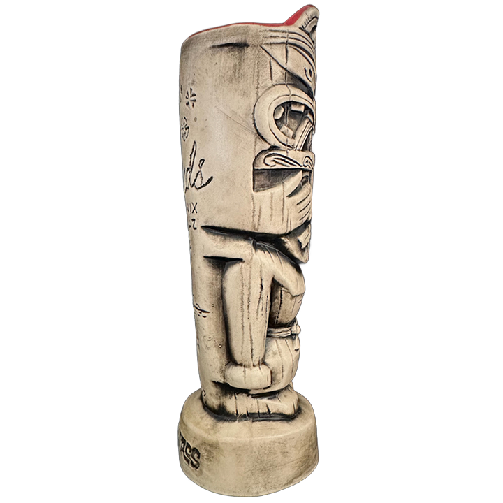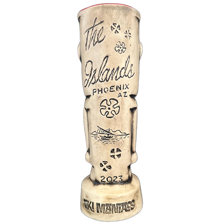 The Hungry Warrior is the exclusive event tiki mug for the 2nd annual Superstition Village Tiki Marketplace in 2023. The mug is based on the original (uncredited) menu cover art from The Islands Polynesian Restaurant. This legendary Phoenix, Arizona tiki establishment opened in 1958 and served the original generation of tiki fans until sometime in the mid 1980s when it was unceremoniously demolished. 2023 marked what would have been The Island’s 65th Anniversary, so Tiki Maniacs decided it was a fitting time to do a tribute mug. 150 mugs were made by sculptor and mug producer Patrick Vassar at Monkey Skull Studio in St. Petersburg, Florida. All mugs include a custom made skull design swizzle stick and an exclusive cocktail recipe by legendary Arizona mixologist, Dan Choiniere (aka Tiki Dan).