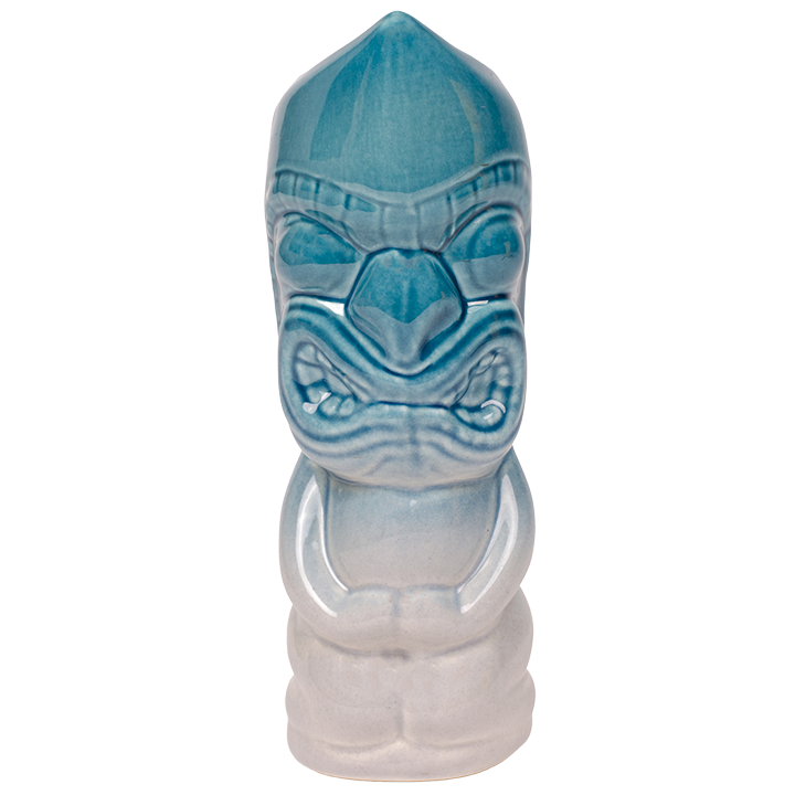 This ceramic mug depicts a simplistic Tiki with a mouth shaped like the number eight and a headdress.