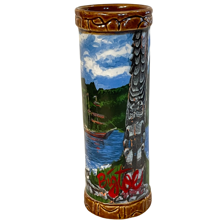 This ceramic tiki mug features an original painting by artist BigToe named “Forbidden Island”, that is applied as a fired on decal. The art piece depicts a beautiful wahine spotting a ship in beautiful Polynesian waters. She is surrounded by two tall Tikis.