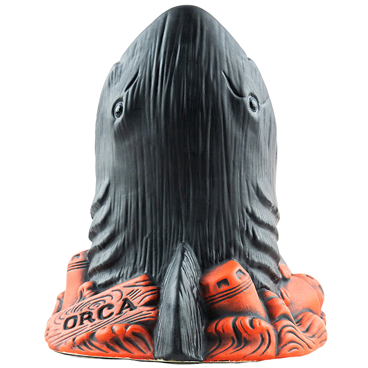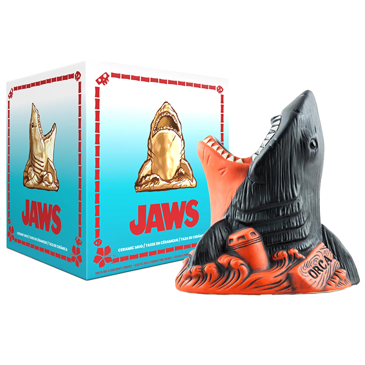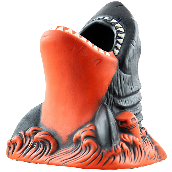 Inspired by the motion picture Jaws, this ceramic cocktail mug depicts Bruce the Shark jumping out of the ocean among crashing waves and a floating barrel. This mug was designed by Mike Bonanno for Mondo and manufactured by Tiki Farm.