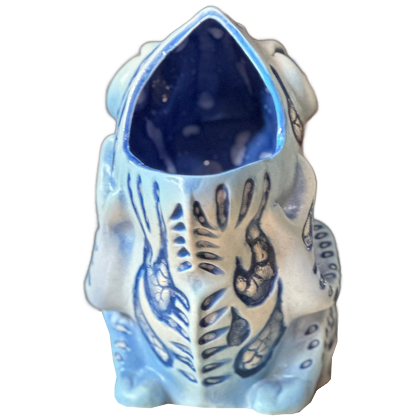 This ceramic cocktail mug was designed and produced in the United States by Riki Tat Tiki. It depicts a chamelon with his mouth open and it was inspired by both the tropical cocktail “The Suffering Bastard” created by Bartender Joe Scialom, as well as Pascal the charming chameleon companion from the animated Disney film Tangled. This particular mug is one-of-a-kind. It features hand carved details and a blue and white “glacial” glaze.