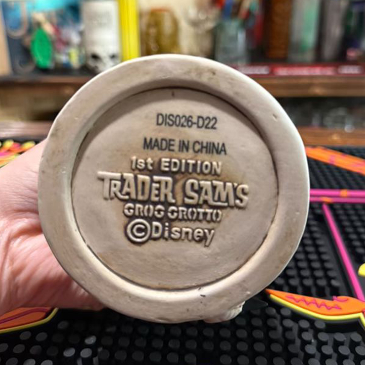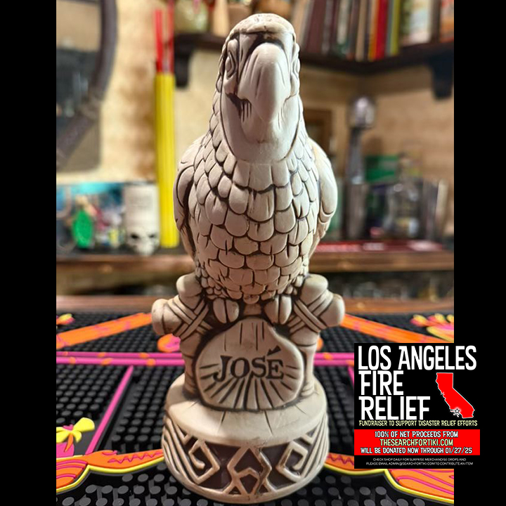 This ceramic cocktail mug was generously donated from a private collection to raise funds for charity. 100% of the net proceeds from this mug will be donated to support relief efforts in LA after the recent devastating wildfires. This ceramic cocktail mug was designed by Marcus Gonzalez and Tim Wollweber for Trader Sam’s Grog Grotto located within Disney’s Polynesian Village Resort, and it depicts the bird Jose, a star from the famous attraction Walt Disney’s Enchanted Tiki Room. Jose is depicted resting on his perch with a seashell name placard and a base accented with tribal designs.