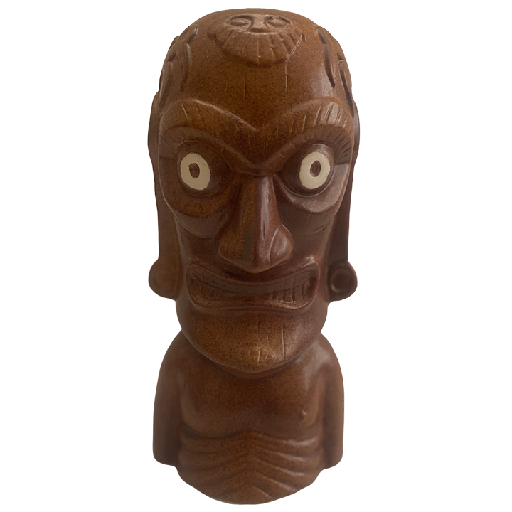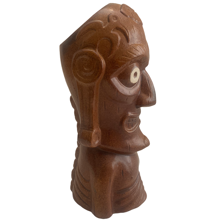 This ceramic mug is in the shape of a bust and depicts a wide-eyed tiki person with gauged ears and exposed ribs.