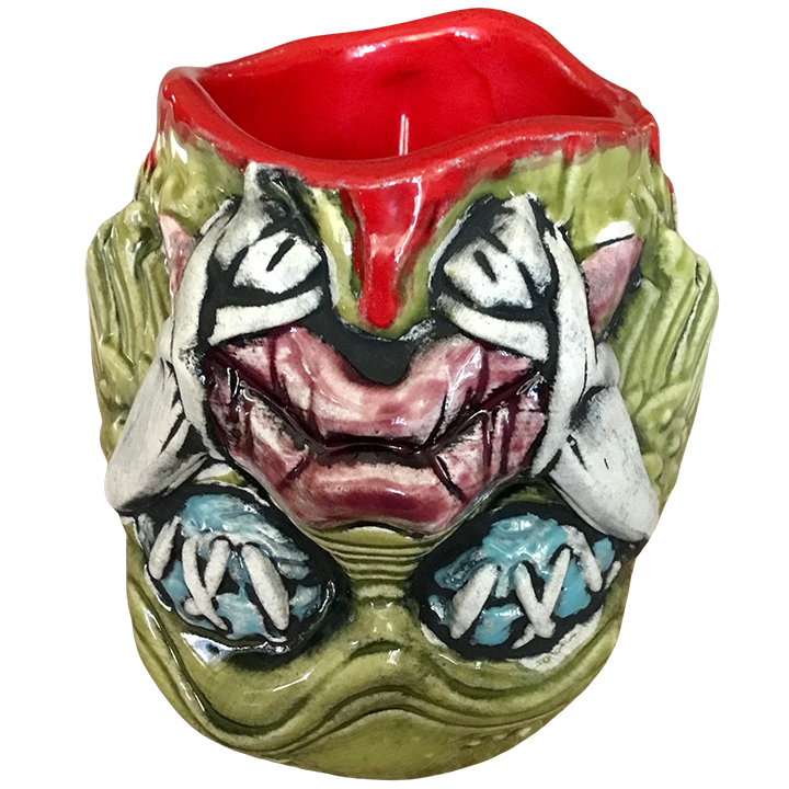 This ceramic tiki mug depicts the shrunken head of Creature from the Black Lagoon, a Universal Monster.