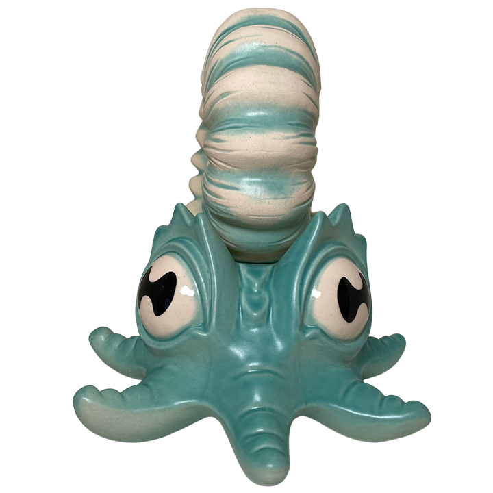 This ceramic cocktail mug depicts a giant ammonite in its infancy. It was made using multiple molds and the first Sunset Crawler edition had a glaze change to blue after crazing was discovered with the original glaze. Each mug was randomly shipped with one of four sets of eye pupils.