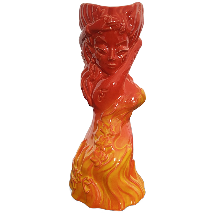 This ceramic cocktail mug was designed by Tom “BigToe” Laura for Paradise Lost in New York City. It depicts the seductive demoness Lilith surrounded by flames and this 1st Edition features a red and yellow ombre glaze.