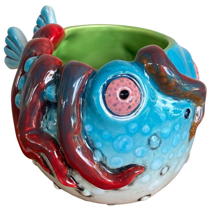 This ceramic cocktail mug depicts a smiling pufferfish in an engorged state. This version has the addition of octopus tentacles wrapped around the fish.