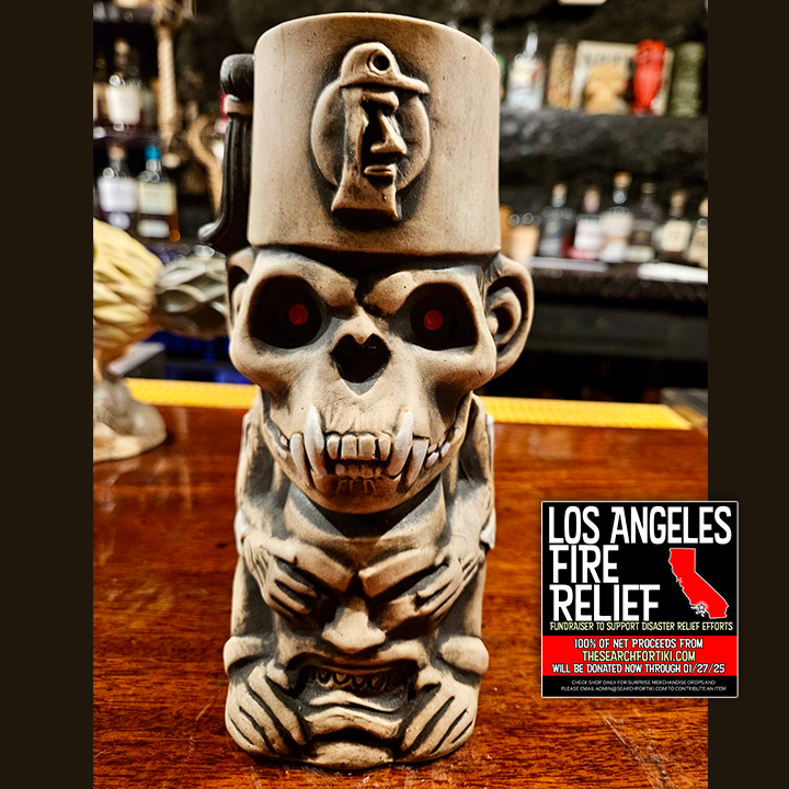This ceramic cocktail mug was generously donated by Tiki Underground to raise funds for charity. 100% of the net proceeds from this mug will be donated to support relief efforts in LA after the recent devastating wildfires. This is Tiki Underground’s 3rd Anniversary mug custom designed, produced, and hand painted by Eekum Bookum, released in October, 2024.