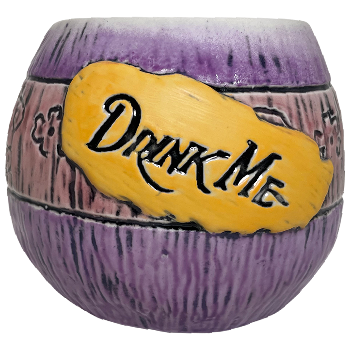 This ceramic cocktail mug depicts a classic coconut with a “Drink Me” driftwood sign on the front that is inspired by Alice in Wonderland.