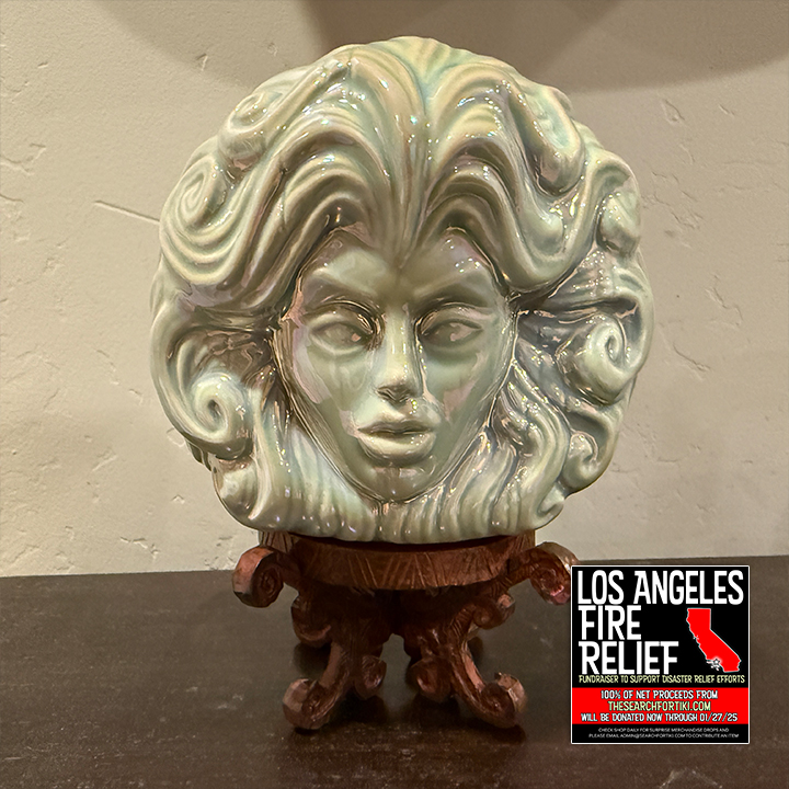 This ceramic cocktail mug was generously donated from a private collection to raise funds for Los Angeles. 100% of the net proceeds from this print will be donated to support relief efforts in LA after the recent devastating wildfires. This ceramic cocktail mug was designed by Tank Standing Buffalo as part of a Disney Artist Showcase series for 1901 Lounge. It depicts the iconic fortune teller Madame Leota from Walt Disney’s The Haunted Mansion theme park attraction. Madame Leota is depicted in the shape of a crystal ball and the mug comes with a mixed media stand for display purposes. The back of the mug depicts several musical instruments that are known to play themselves in The Haunted Mansion.