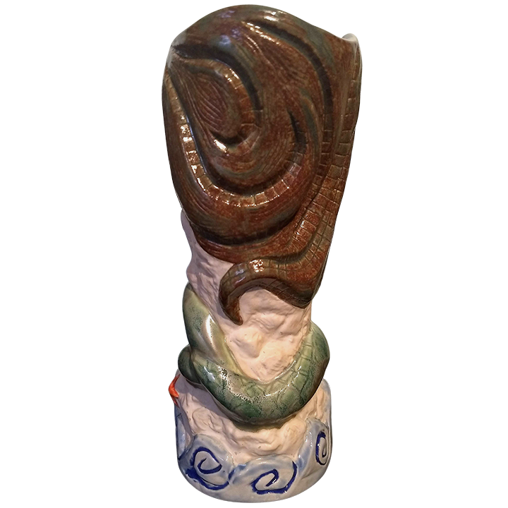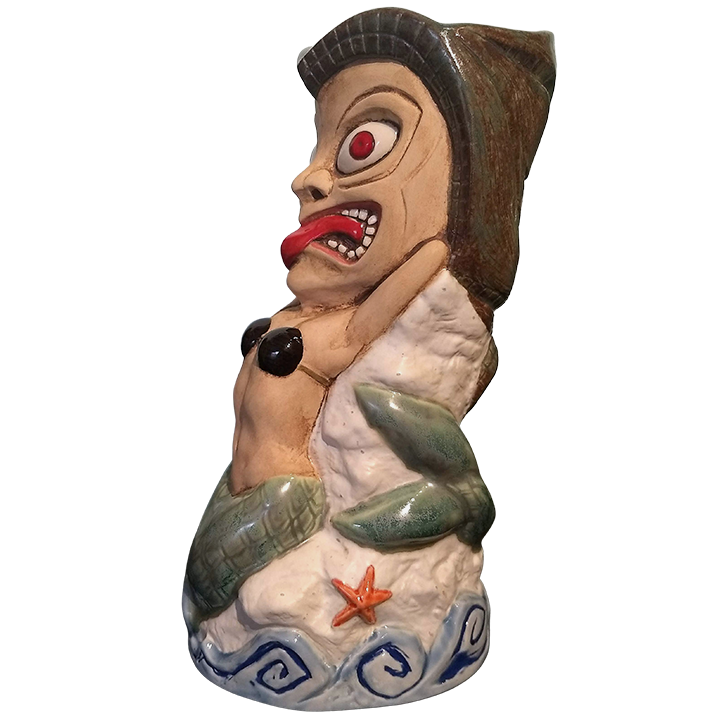 This ceramic Tiki mug depicts a Japanese-influenced mermaid, slightly cross-eyed with her red tongue out. Her eyes are red; her tail iridescent green. She is holding her hands behind her head, with dark-brown hair that is stylized almost like a helmet. The shape is somewhat hourglass; she is intended as a Fogcutter mug. Shima released a low edition of these mugs, unglazed except for an oxide wipe, in 2016 (marked on the bottom of the mug). In addition, he occasionally releases a few in one-of-a-kind glaze painting.