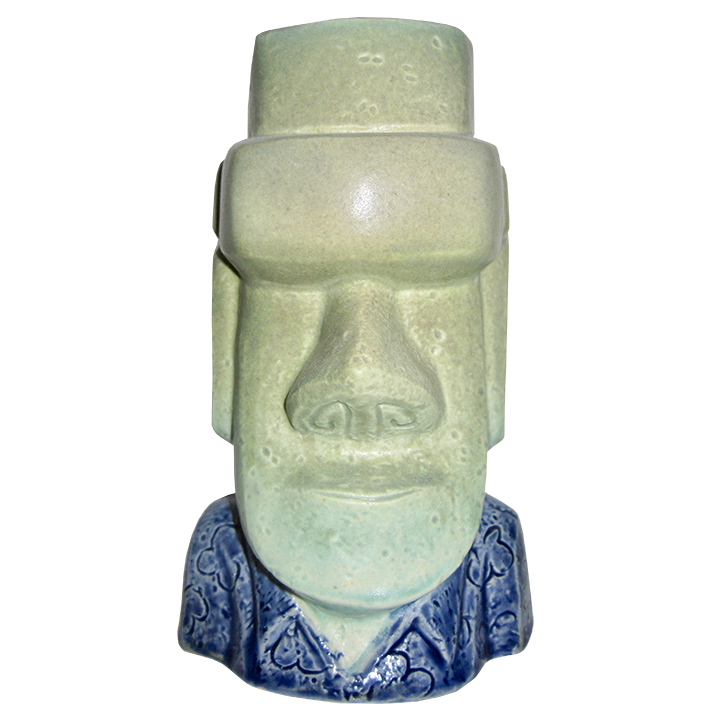 This ceramic tiki mug depicts a Moai head wearing a Hawaiian shirt.
