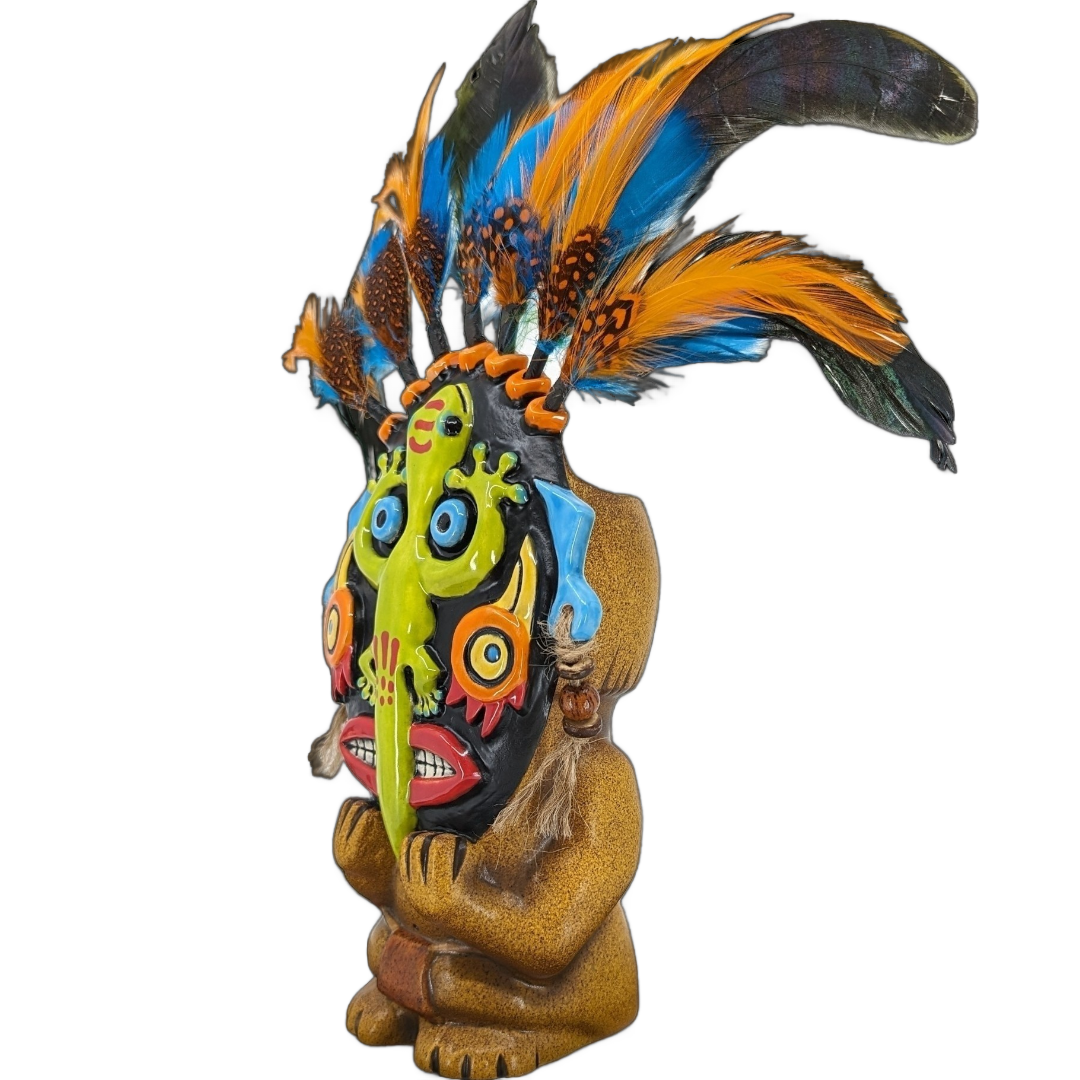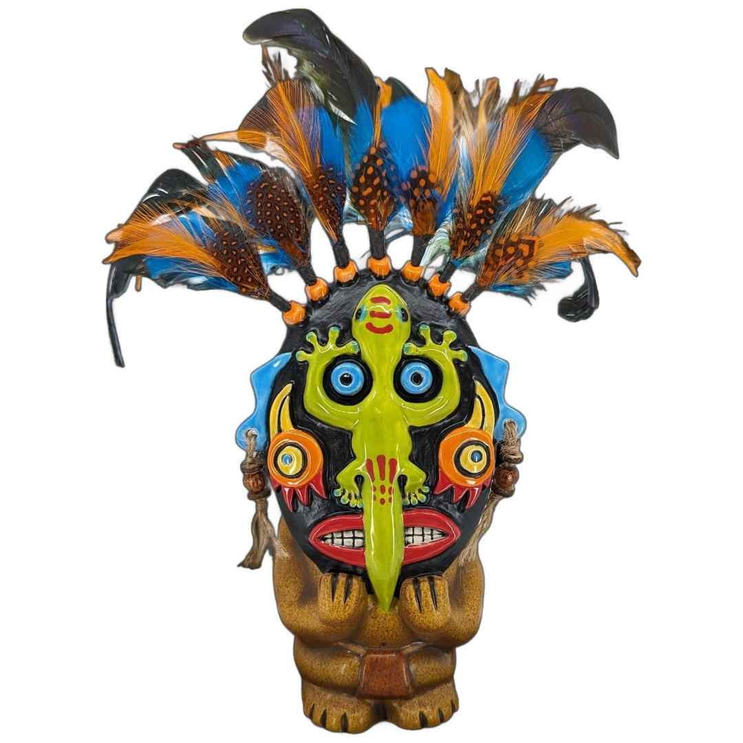 This ceramic Tiki mug by TikiRob depicts a standing person wearing a PNG “Papua New Guinea” style mask. The face on the mask is made up of small, circular eyes, a gecko for a nose, and two bird heads as cheeks. This is the glossy version, limited to only 30 made.