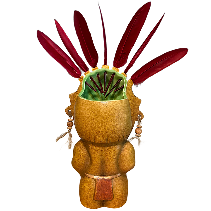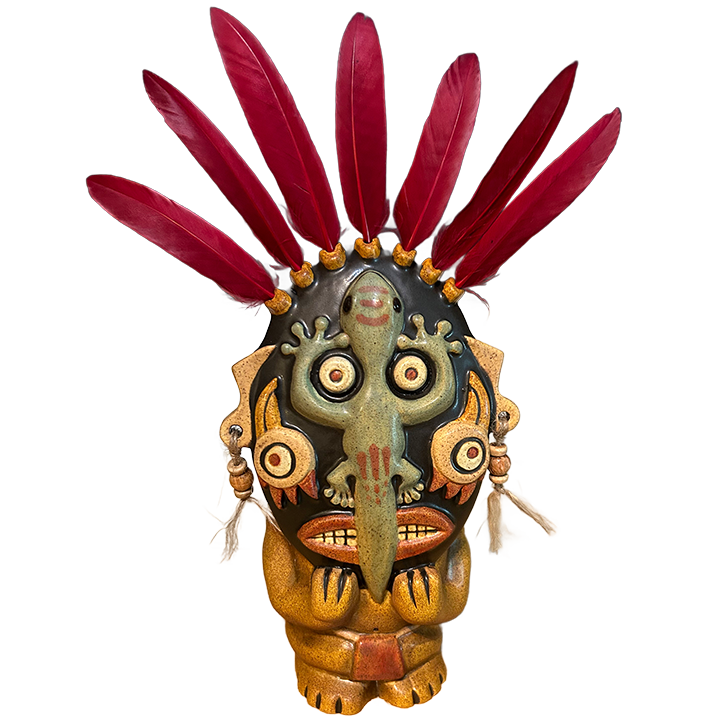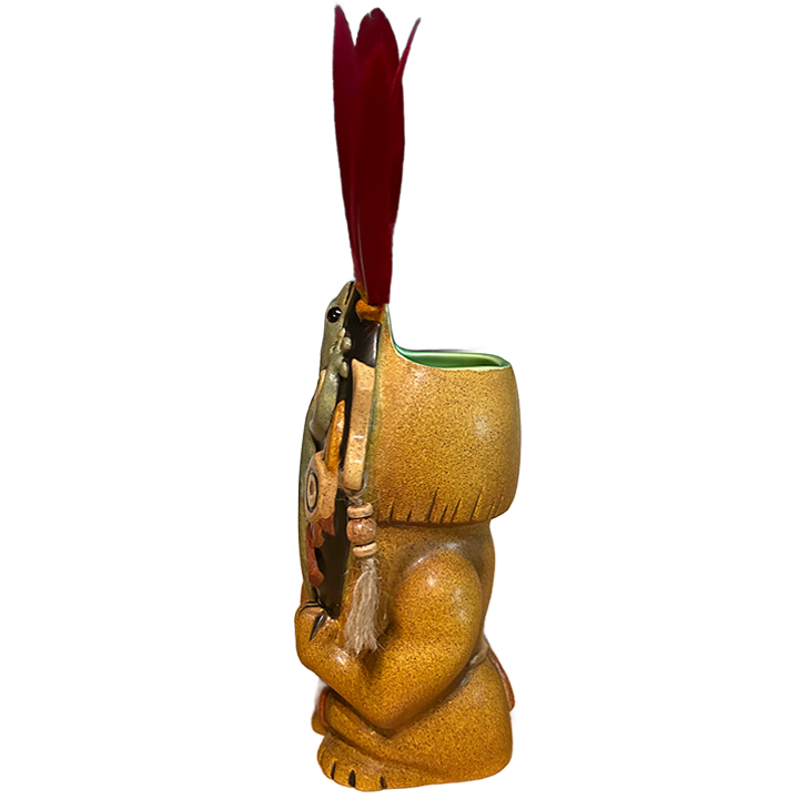This ceramic Tiki mug by TikiRob depicts a standing person wearing a PNG “Papua New Guinea” style mask. The face on the mask is made up of small, circular eyes, a gecko for a nose, and two bird heads as cheeks. This is the matte version, limited to only 25 made.