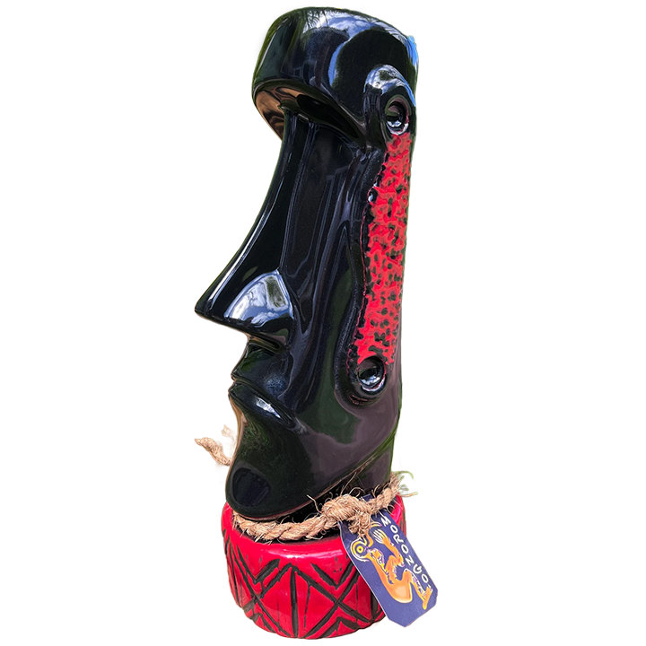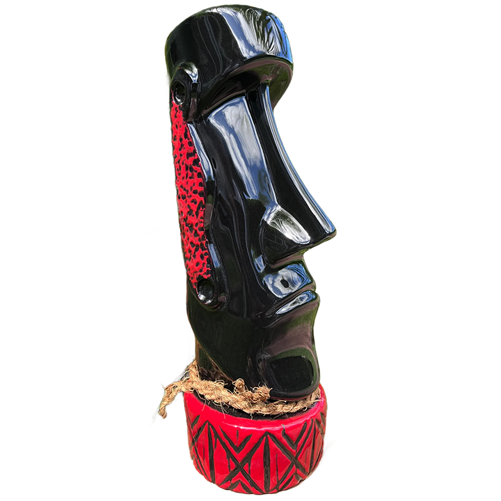 This ceramic tiki mug depicts a traditional Moai head on top of a circular base. It was designed and manufactured by TikiPop for his Maui-based shop Beachbumz. Each Morongo mug features a one-of-a-kind glaze. This particular mug has a mostly black glaze with red on the ears and base,