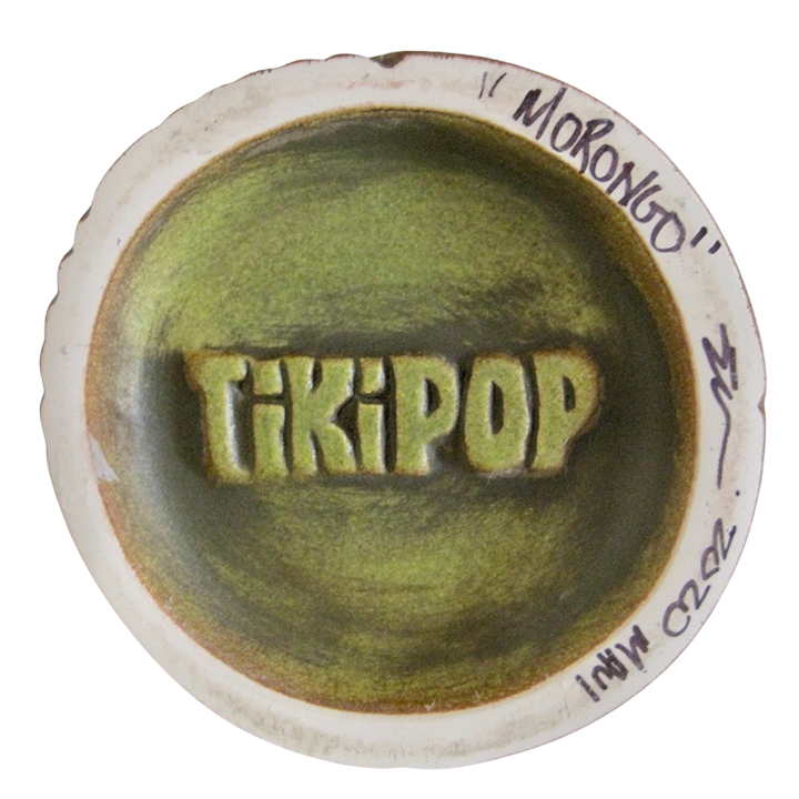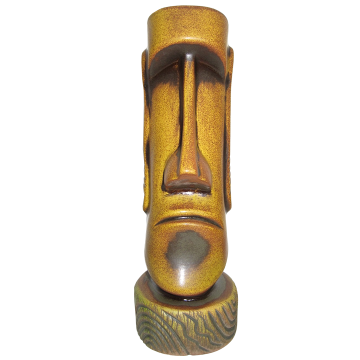 This ceramic tiki mug depicts a traditional Moai head on top of a circular base. Each Morongo mug features a 1/1 glaze and unique illustrations around the base.