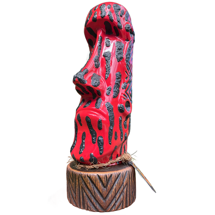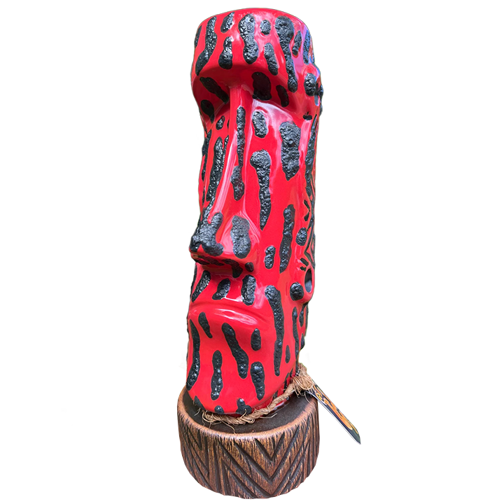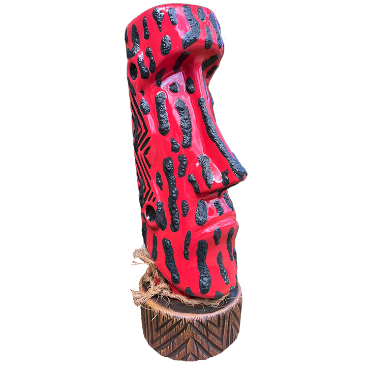 This ceramic tiki mug depicts a traditional Moai head on top of a circular base. It was designed and manufactured by TikiPop for his Maui-based shop Beachbumz. Each Morongo mug features a one-of-a-kind glaze. This particular mug has a mostly red glaze with black lava drips and a brown base.