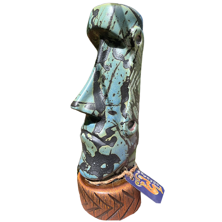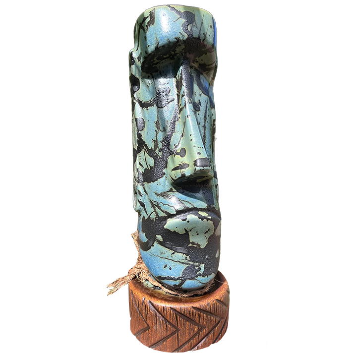 This ceramic tiki mug depicts a traditional Moai head on top of a circular base. It was designed and manufactured by TikiPop for his Maui-based shop Beachbumz. Each Morongo mug features a one-of-a-kind glaze. This particular mug has a glaze that is loosely inspired by the artwork of Jackson Pollock.